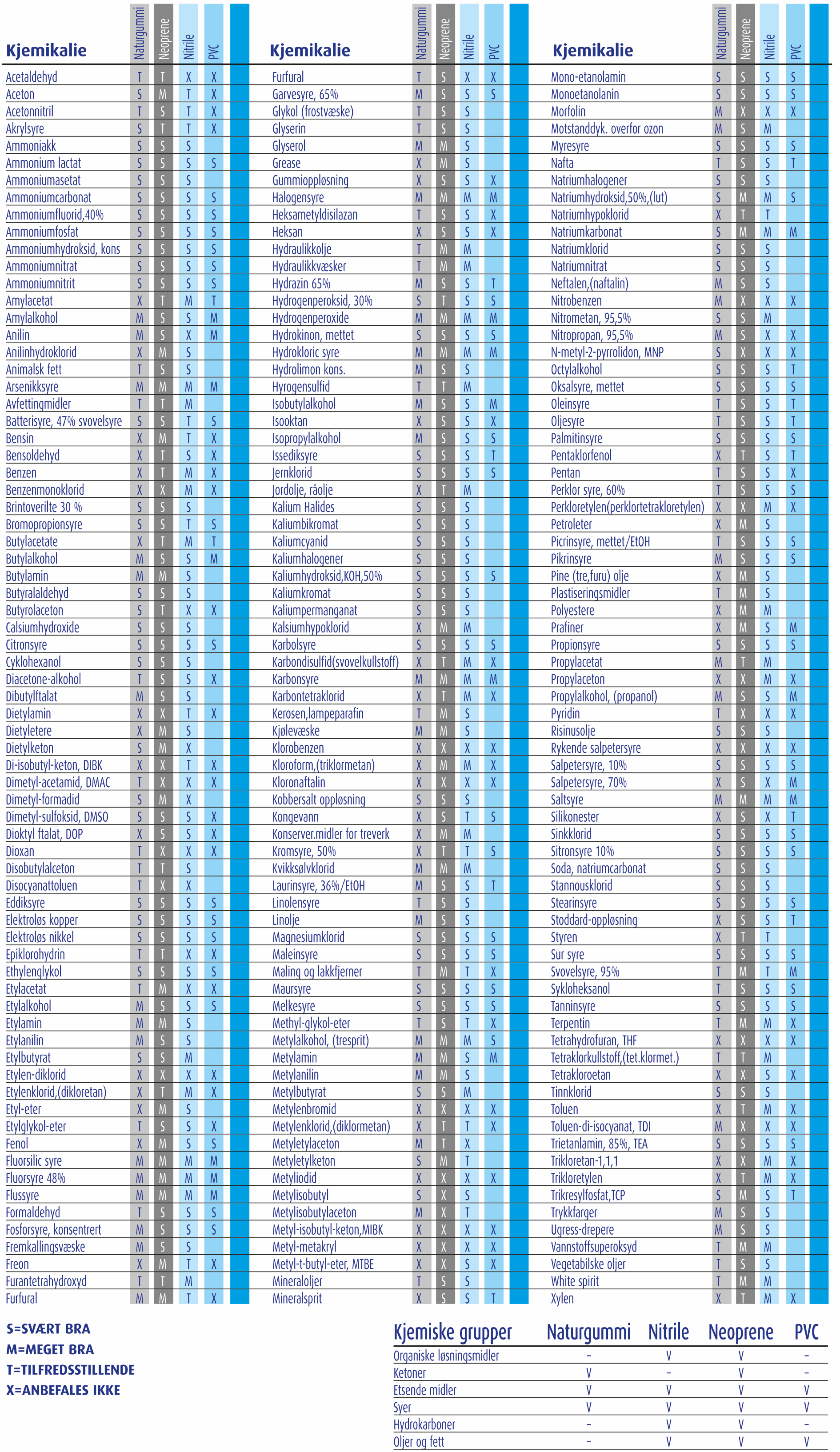 Tabellen er veiledende og egne tester må gjøres for spesielle arbeidsforhold. Hansker med samme handelsbetegnelse, nitril, gummi, PVC etc. fra forskjellige produsenter kan ha forskjellige egenskaper. Derfor må hansken vurderes i hvert enkelt tilfelle.