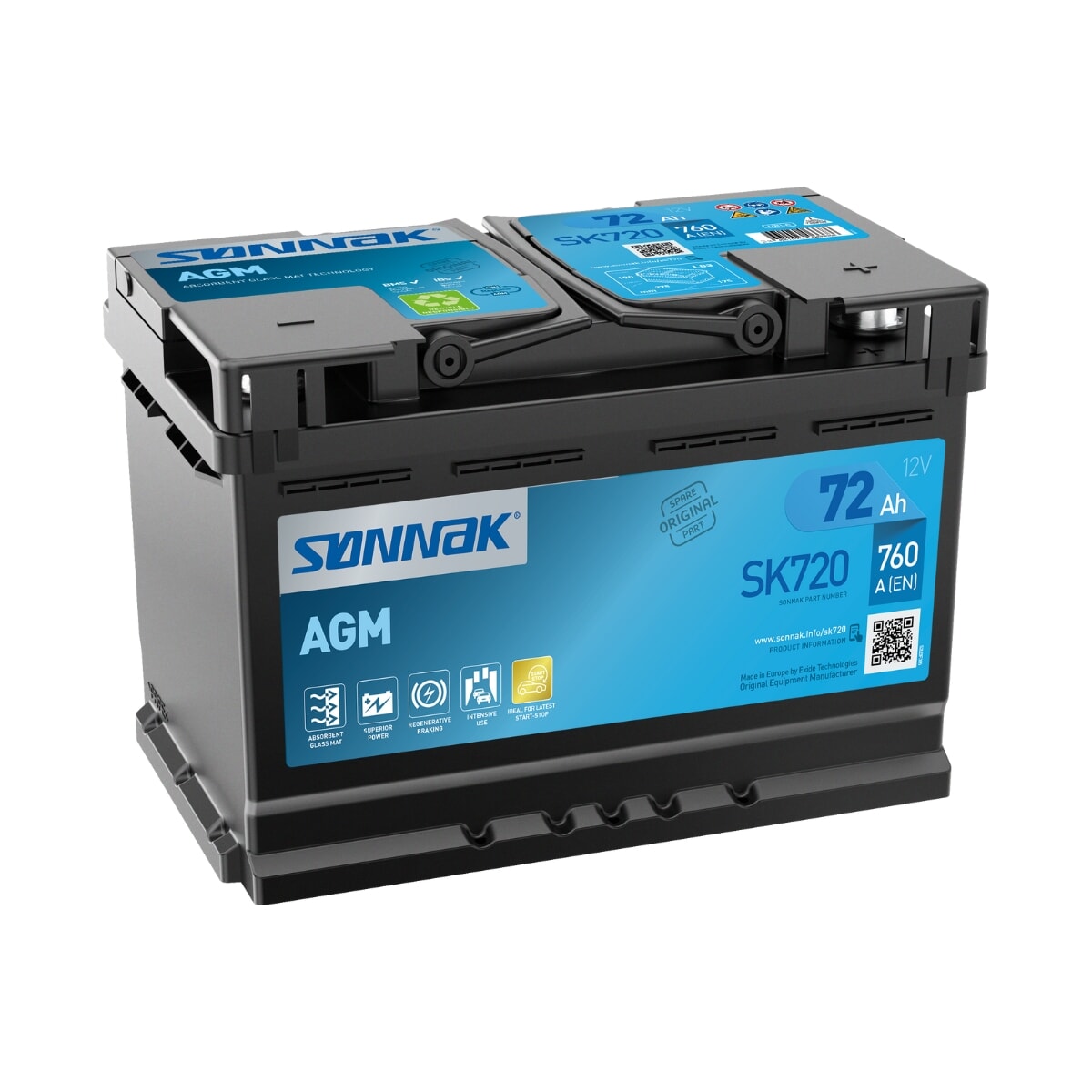 SK720 AGM Batteri fra Sønnak. Sønnaks AGM-batterier (Absorbent Glass Mat) bruker høyytelseskomponenter og -materialer, inkludert glassmatteskiller med stor kontaktflate, avanserte bly/tinn-legeringer og unike karbonadditiver i den aktive massen. Banebrytende LifeGrid ™ -teknologi gir stabil kraft og forbedret utholdenhet.