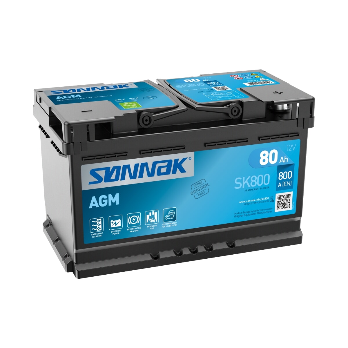 SK800 AGM Batteri fra Sønnak. Sønnaks AGM-batterier (Absorbent Glass Mat) bruker høyytelseskomponenter og -materialer, inkludert glassmatteskiller med stor kontaktflate, avanserte bly/tinn-legeringer og unike karbonadditiver i den aktive massen. Banebrytende LifeGrid ™ -teknologi gir stabil kraft og forbedret utholdenhet.