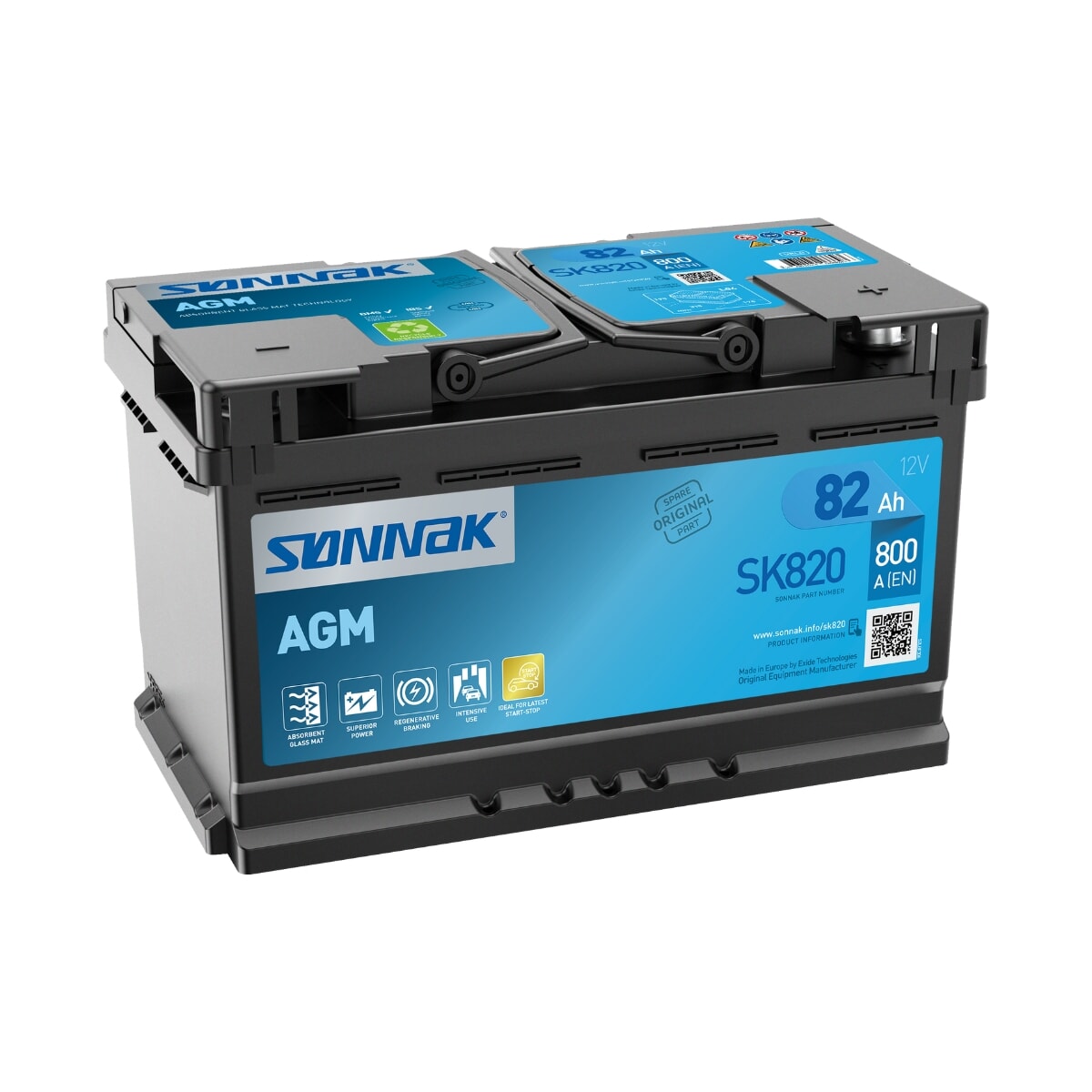 SK820 AGM Batteri fra Sønnak. Sønnaks AGM-batterier (Absorbent Glass Mat) bruker høyytelseskomponenter og -materialer, inkludert glassmatteskiller med stor kontaktflate, avanserte bly/tinn-legeringer og unike karbonadditiver i den aktive massen. Banebrytende LifeGrid ™ -teknologi gir stabil kraft og forbedret utholdenhet.