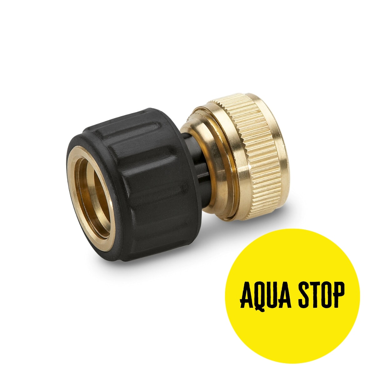 Slangekobling i robust kvalitesmessing. Ergonomisk gummiring på håndtak for enkel håndtering og forbedret feste. Sprutfri frakobling med Aqua Stop.
