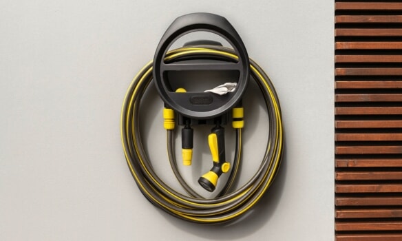 Enkel og kompakt oppbevaring med et diskré design: Med dette veggmonterte slangeopphenget kan hageslangen oppbevares på veggen for å spare plass. Holderen har egne spor for oppbevaring av tilbehør som spylemunnstykker og slangekoblinger, samt et oppbevaringsrom for annet vanningsutstyr.