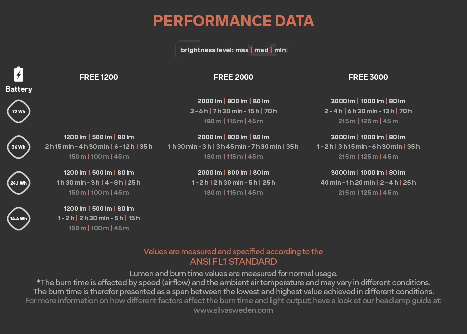 Tips! Du kan også benytte 36 Wh batteri med denne hodelykten. Du vil da kunne øke brukstiden betraktelig. Les mer om ytelse og brukstid i tabellen nederst.