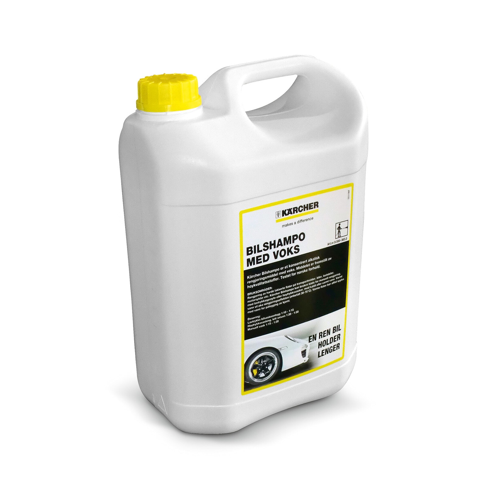 Kärcher Bilshampo er er konsentrert alkalisk rengjøringsmiddel fremstilt av høykvalitetsstofferberegnet for rengjøring av harde lakkerte flater på biler, lastebiler, motorsykler etc. Bilshampoen kan brukes både for manuell rengjøring, med lavtrykkssprøyte eller høytrykksvasker, med kaldt eller varmt vann. Varmt vann vil øke rengjøringseffekten (anbefalt 30-70°C). Varme flater bør spyles med vann før pålegging av kjemi.