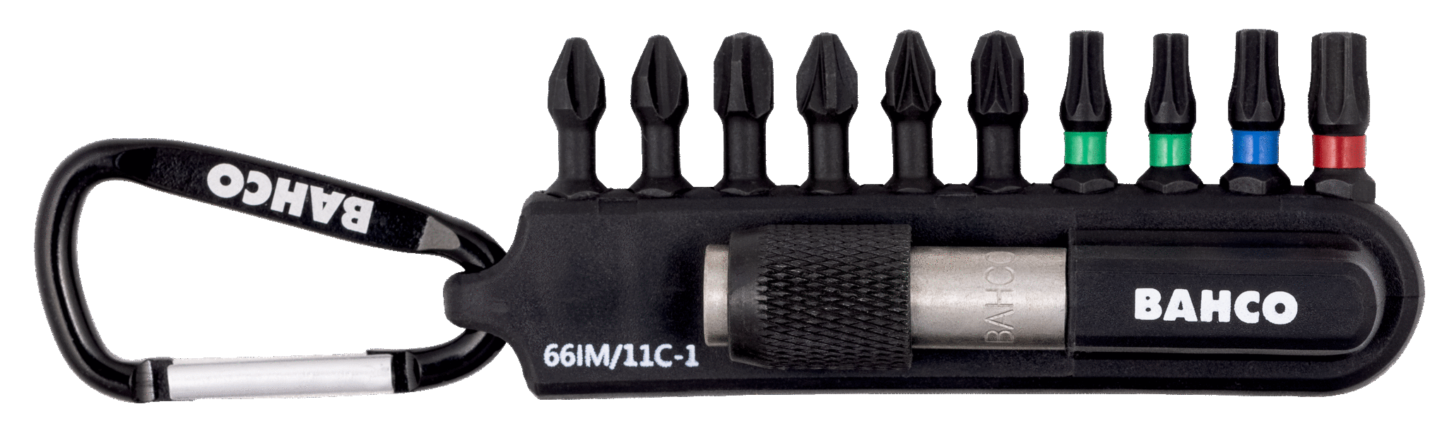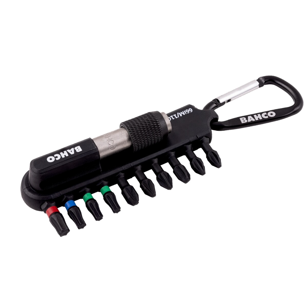 Kraft torsionsbitssett med 10 bits for Phillips, Pozidriv og TORX® skruer. Kommer med praktisk karabinkrok slik at du kan feste bitssettet fast.