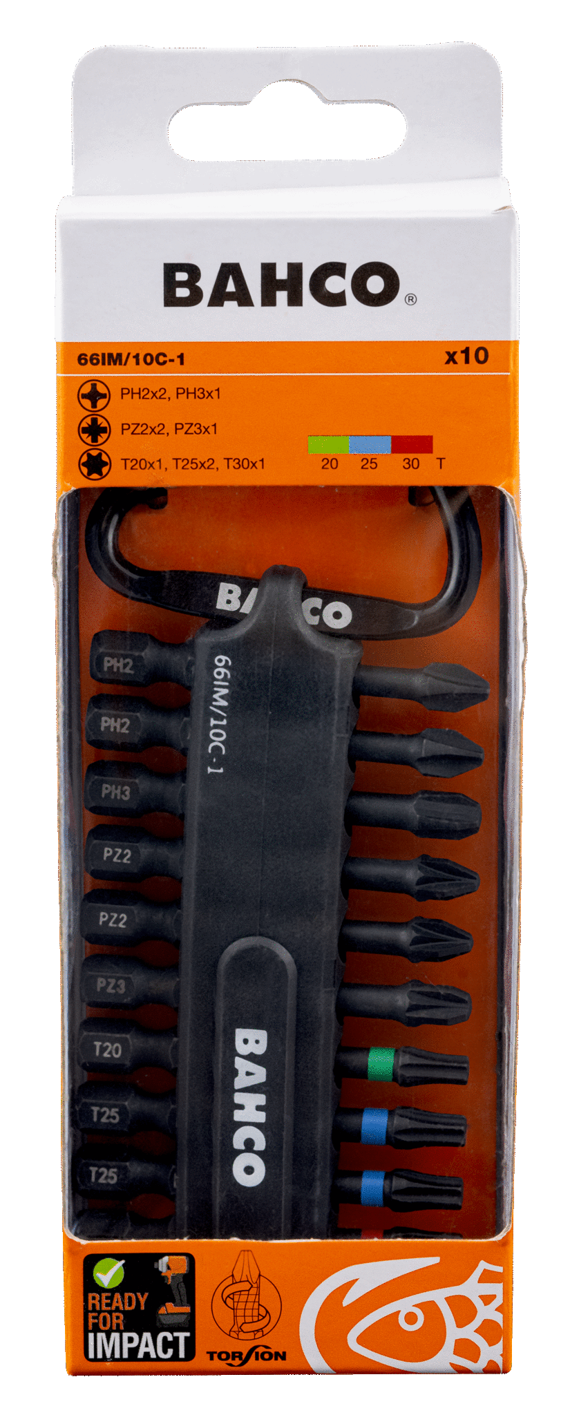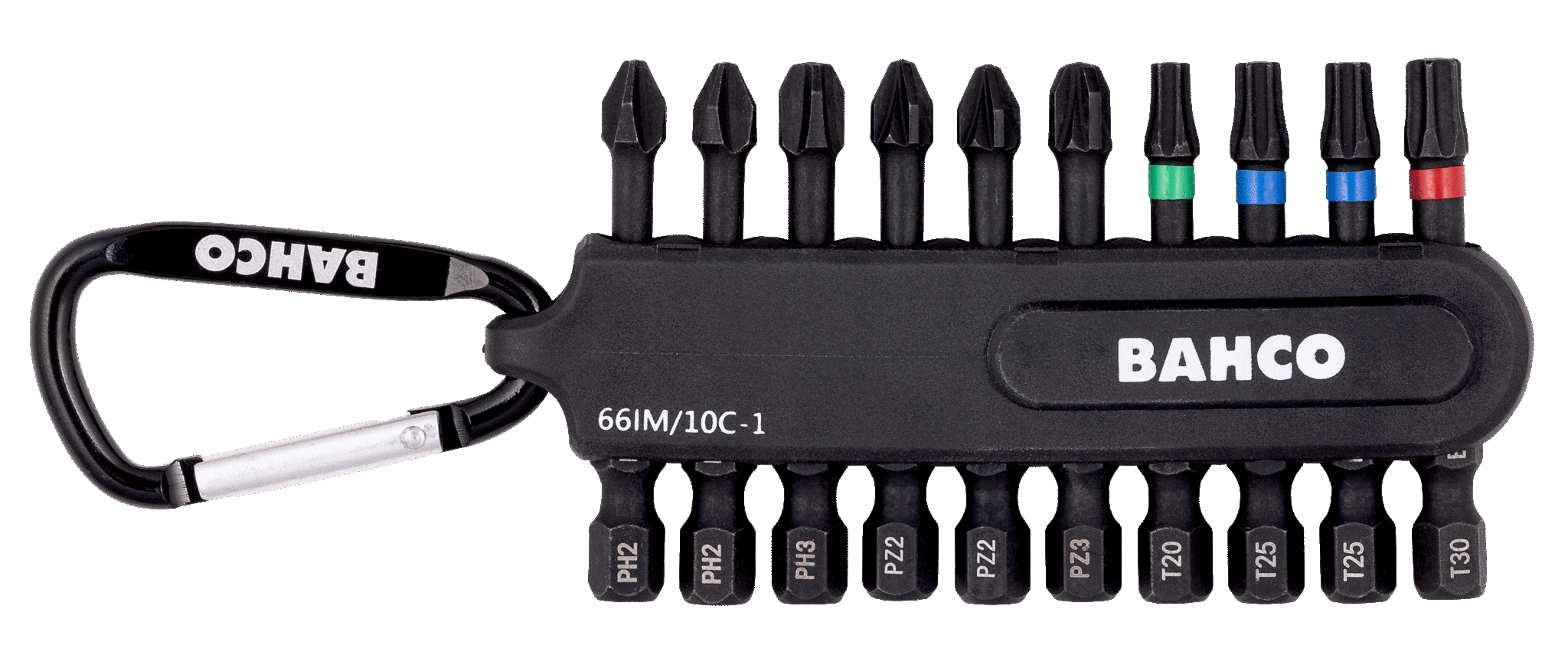 Kraft torsionsbitssett med 10 bits for Phillips, Pozidriv og TORX® skruer. Kommer med praktisk karabinkrok slik at du kan feste bitssettet fast.