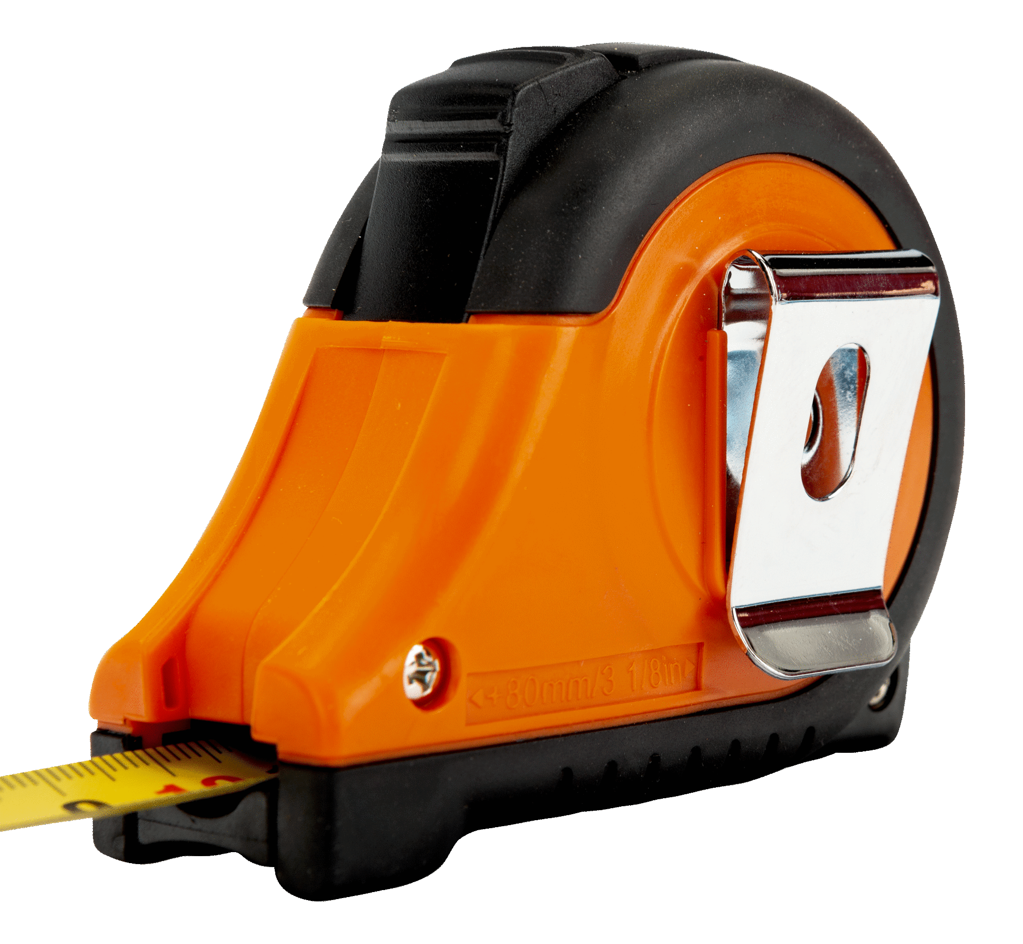 Målebånd med automatisk bladlås som gjør det enkelt å bruke, siden bladet forblir ute til inntrekkingsknappen aktiveres.