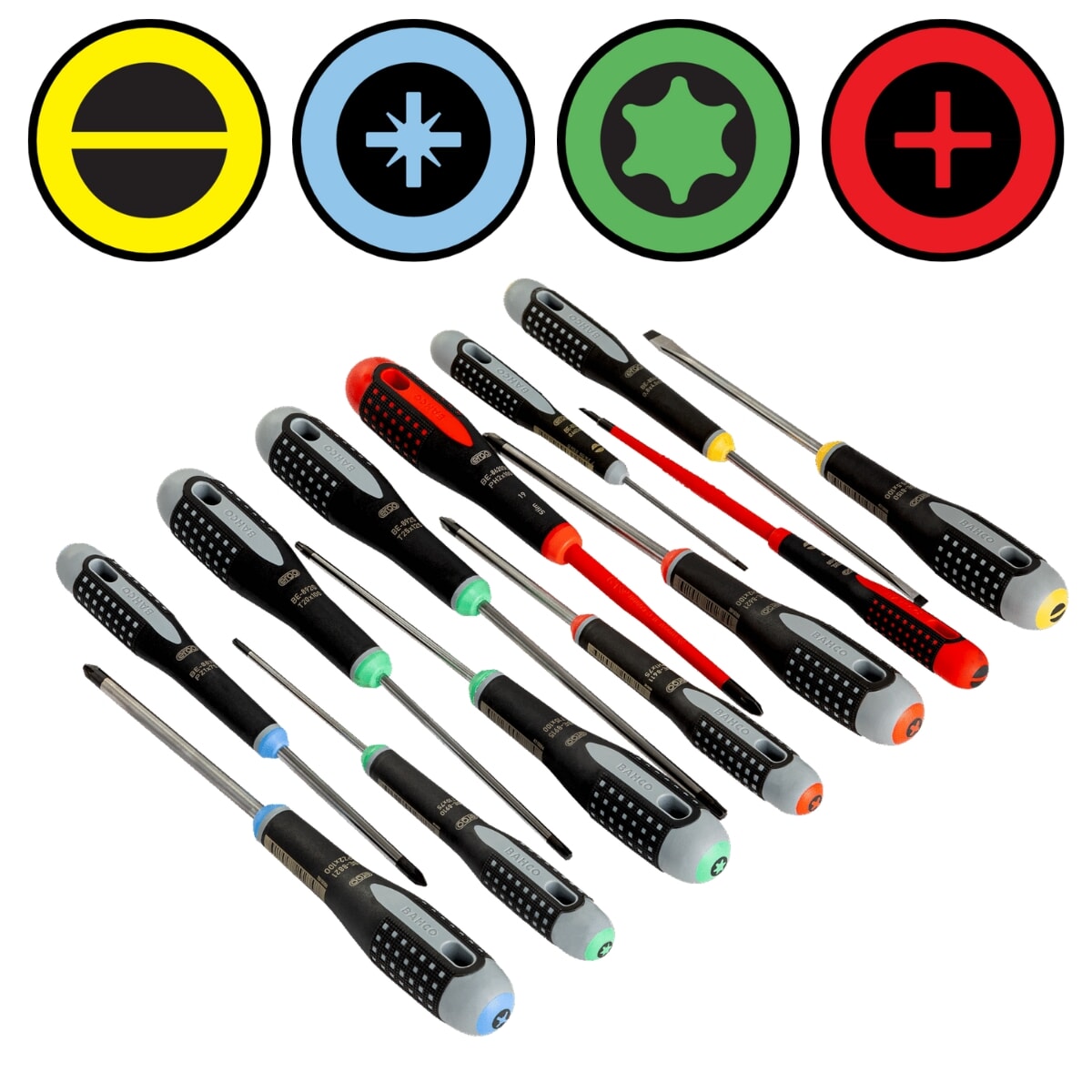 Det tre-komponents håndtak for maksimal brukerkomfort, mykt materiale med riflet overflate som gir overlegent grep og større kraftoverføring. Håndtaket har fargekoding og symbolmerking, slik at du enkelt finner riktig skrutrekker med riktig spiss.