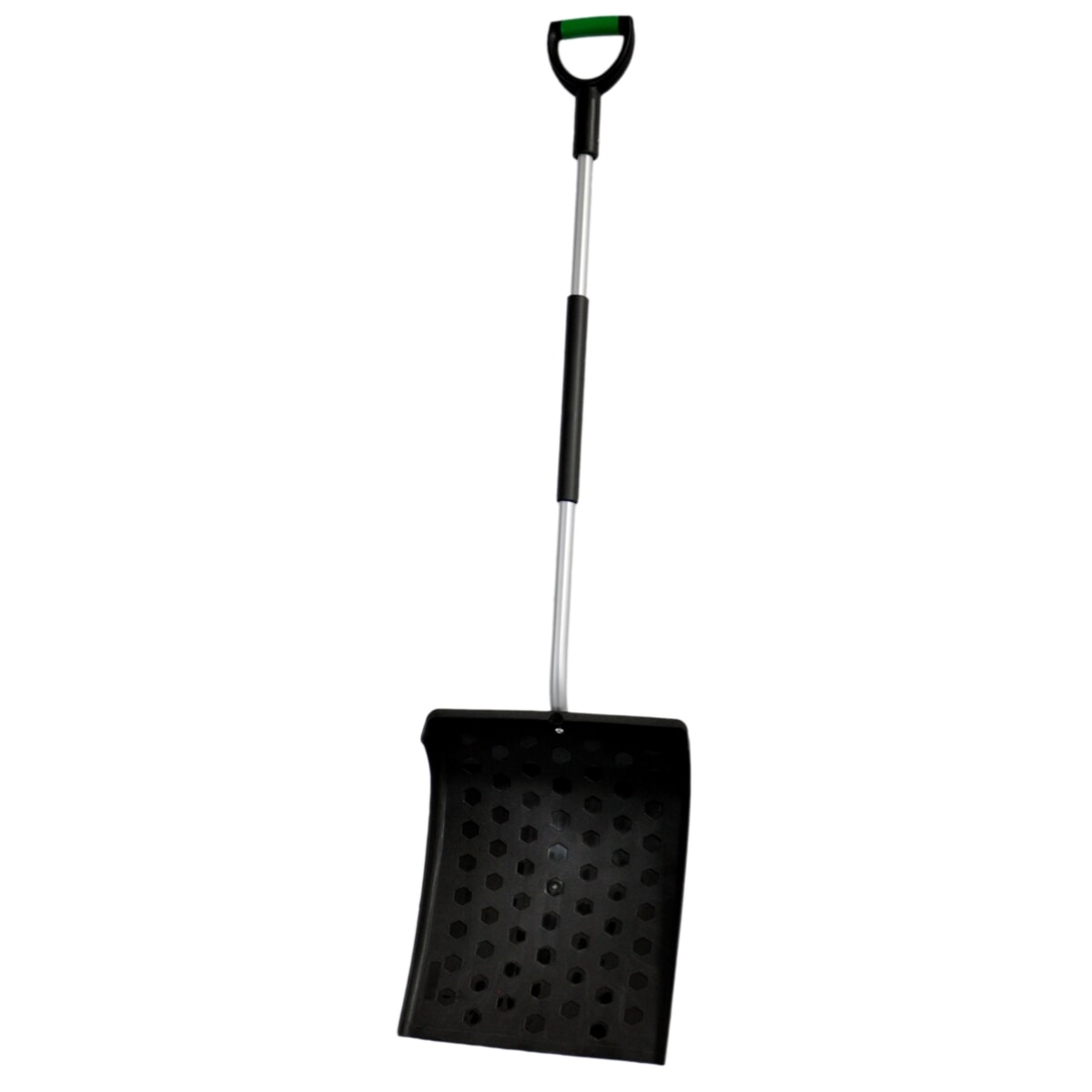 Snøskuffe i plast med aluminium skaft og mykt plasthåndtak.