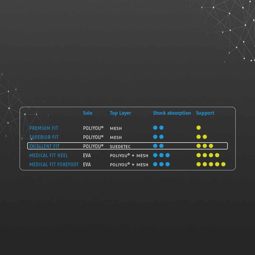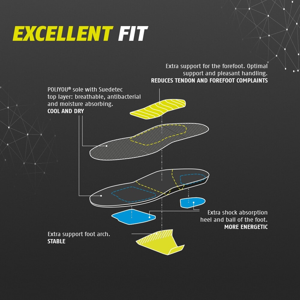 Excellent Fit innleggssålen sørger for ekstra demping for hælen og forfoten. Øverst har sålen et lag med Suedetec, for best mulig transport av fuktighet, det er også antibakterielt.